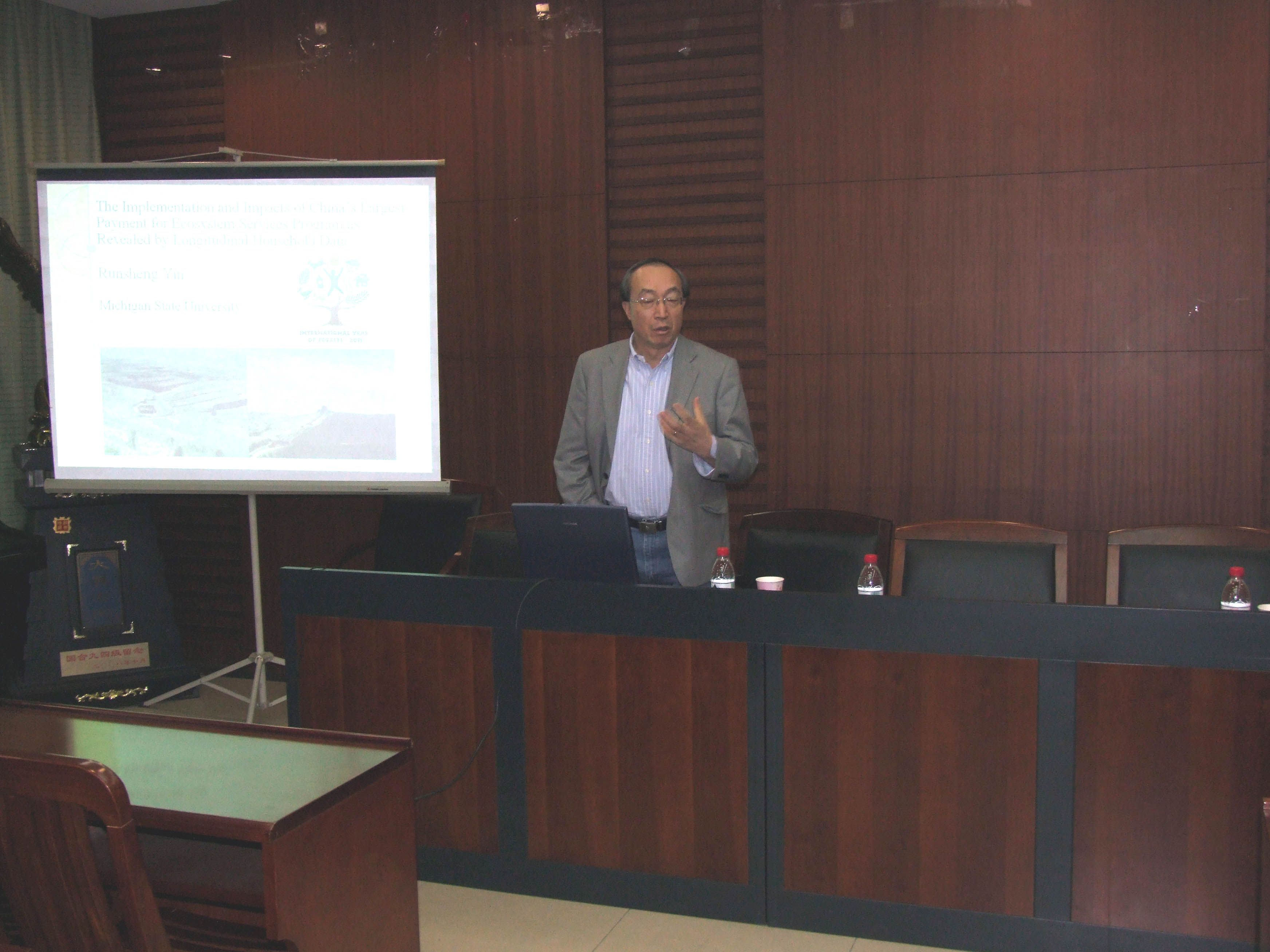 支持的“grain for green”以粮食换绿色的项目的一部分。该项目自1999年以来在我国西部地区实行。这一项目是我国西部地区生态修复和生态补偿的有益尝试。尹教授在讲解中运用大量的数据和图表,借助于经济学的基本分析工具,不仅给师生们传达了这个项目本身的研究成果,如农民劳动时间的变话、净收益的增加、耕地林地的增加、生态的改善等,更重要的是给我们传达了这个研究项目背后透露出的学者的严谨的治学态度、科学的治学方法。尹教授主讲完后与学生们进行了有效的互动。学生们除了就这个项目本身的问题进行了热烈的讨论外还就调查研究方法问题向尹教授请教,如问卷调查的设计问题、调查工作的有效执行问题等等,尹教授耐心地一一作答。报告会在热烈的气氛中结束。