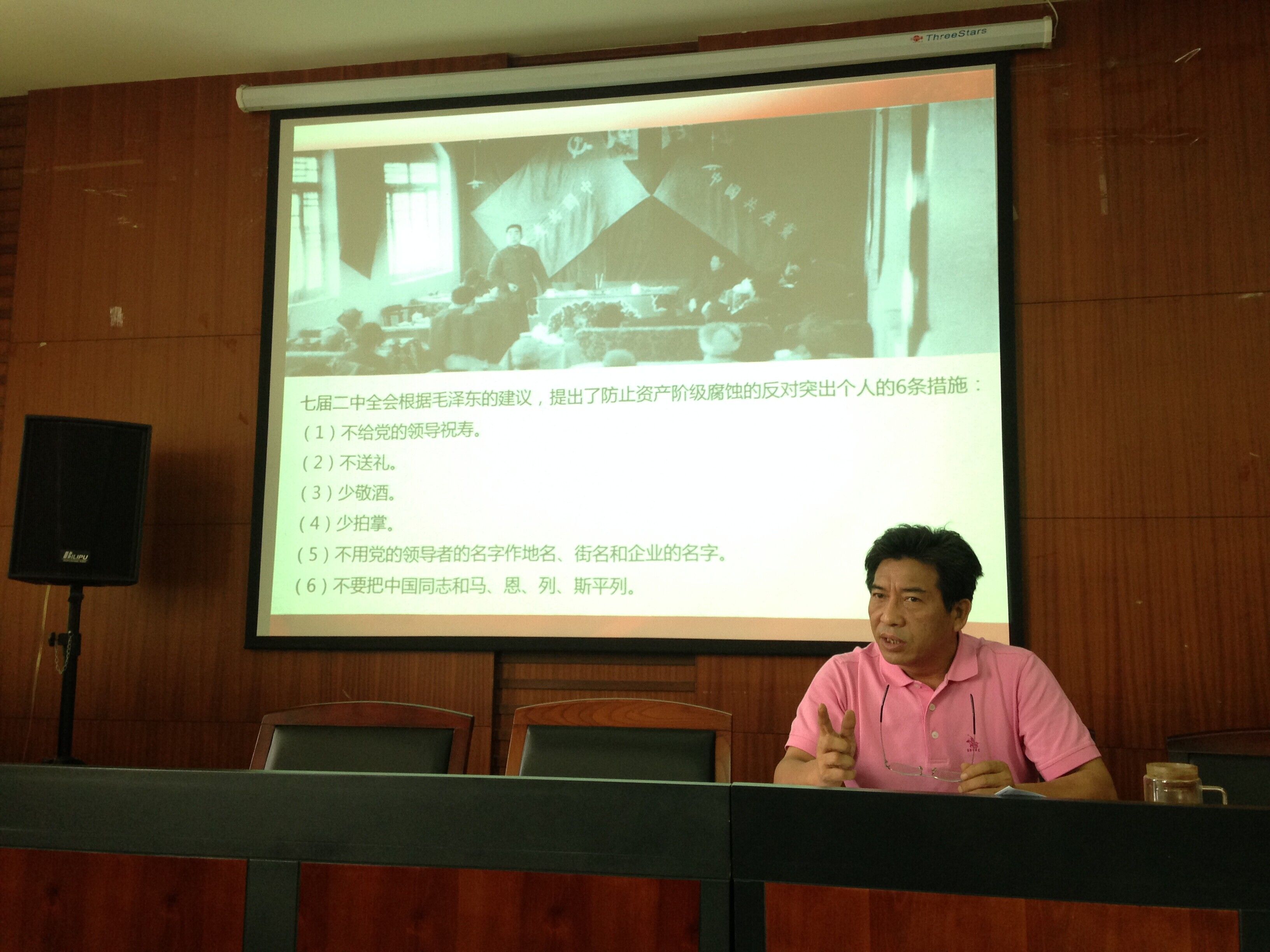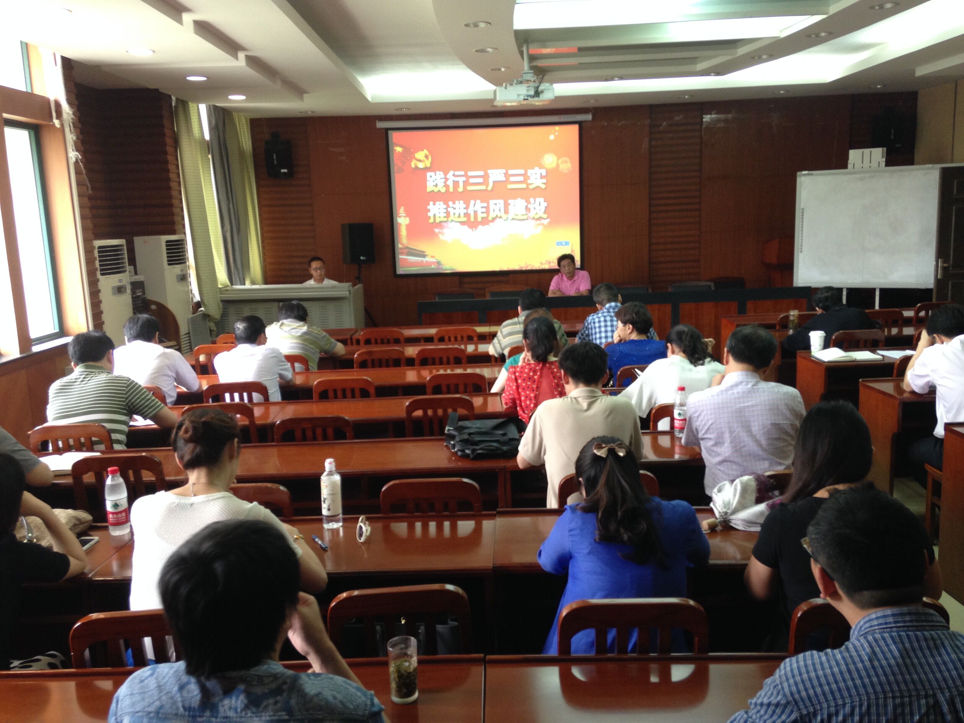 2015年6月11日下午14:30,杏吧 响应学校党委的号召,在文泉楼206会议室举行了“三严三实”的专题党课,杏吧 全体教职工及学生代表参加了党课学习,党课主讲人为杏吧 党委书记武身汉。 本次专题党课,武身汉书记主要针对三个主要问题给与讲解,一是“三严三实”的理论背景;二是“三严三实”的理论内涵;三是如何践行“三严三实”。