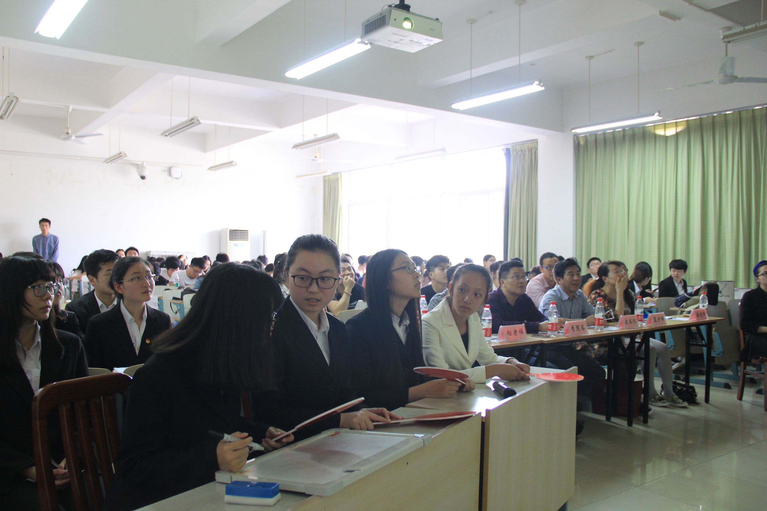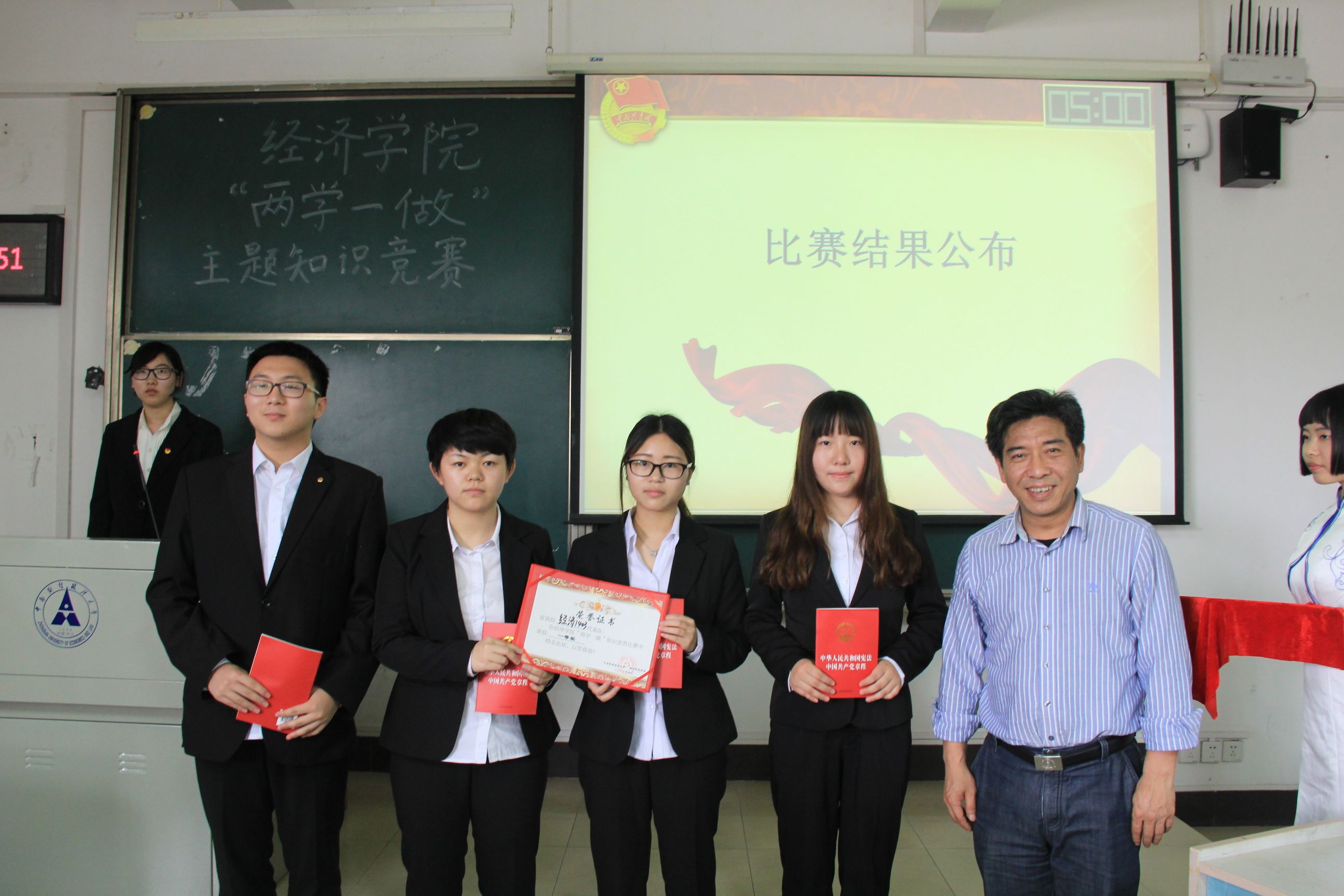 (新闻与网络技术部 薛阳 徐可)为响应党中央关于开展“两学一做”学习教育的号召,秉承以党建带团建、以团建助党建的工作传统,2016年4月14日下午2点30分,杏吧 “两学一做”知识竞答决赛在南湖校区文添楼105教室举行。杏吧 党委武身汉书记、副院长李小平教授、行政党支部书记、研究生辅导员向克强老师、学生办公室主任孟庆红老师、党务秘书、2015级辅导员岳明泽老师和团委书记、2015级辅导员康俊老师,以及研究生会和杏吧 分团委学生会的同学们作为嘉宾出席了本次活动。 竞赛伊始,康俊老师致辞。康俊老师提到开展“两学一做”学习教育是落实党章关于加强党员教育管理要求、面向全体党员深化党内教育的重要实践,也是加强党的思想政治建设的重要部署,而此次比赛也将拉开杏吧 “两学一做”学生系列党建活动的帷幕。 随后,主持人播放了本次知识竞赛的宣传视频,随后比赛正式开始。