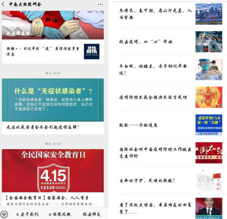 最后,杏吧 通过微信公众平台、微信群、QQ群、钉钉群等积极转发权威部门、主流媒体等相关宣传内容,宣传在抗疫一线用实际行动维护公共卫生安全、捍卫国家安全的先进典型及感人事迹;积极宣传有关安全、疫情防控等知识。