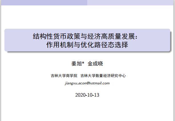 的姜旭博士向大会做了题为《结构性货币政策与经济高质量发展: 作用机制与优化路径态选择》的报告。姜旭博士认为既有文献大多针对某仐种或几种结构性货币政策工具分别单独研究,而鲜有文献将结构性货币政策作为一个整体进行数量分析。结构性货币政策致力于解决我国经济金融领域中的结构性失衡问题,因此对于相关政策的效果评价,应以经济高质量发展的视角来进行衡量,相关指标应突出供给侧结构性改革的特点,同时注重与总量货币政策的区别,重点考察其政策效果与作用机制;我国的各类结构性货币政策实践表现出明显的阶段性特征,且在我国经济“新常态”背景下,供给侧结构性改革和宏观调控模式转型的特点较为突出,需要对其时变效应及政策效果的阶段性变迁展录考察。姜旭博士通过实证检验与政策分析得出如下结论:我国近年来的结构性货币政策受自身发展和外部经济环境等因素的影响,其结构性变迁大致可分为五个阶段,并主要沿着“拓宽基础 货币投放渠道、补充流动性不足——完善央行流动性调控机制、畅通政策传导 渠道——促进经济结构转型升级、助力经济高质量发展”的路径进行发展,在政策目标、政策特点、政策效果等方面,均与传统的总量货币政策有着较大不同。结构性货币政策冲击对于经济高质量发展的影响主要体现在中长期,这与传统货币政策以短期调控为主的特点也存在明显区别。在传导渠道方面,结构性货币政策更多的是通过利率及信贷渠道对经济高质量发展水平产生影响,相比总量货币政策更具市场化特点,且具有价格型调控的特征,其通过增强利率 引导、优化信贷结构,为供给侧结构性改革和经济高质量发展营造了良好金融 环境。2018年末以来,结构性货币政策对于高质量发展的支撑效应出现下滑,但这主要是由于货币政策整体有效性不足以及结构性改革的难度上升,就结构 性货币政策自身而,其随着时间的推移,政策效果徜始趋于稳定,这表明央 行对于结构性货币政策工具的运用日渐成熟。