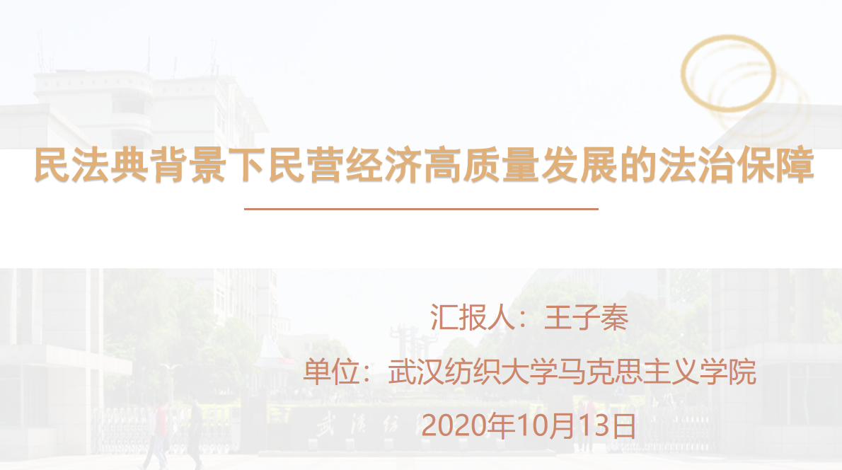 武汉纺织大学马克思主义杏吧 王子秦作了《民法典背景下民营经济高质量发展的法治保障》的报告。王子秦同学表示在推动完善社会主义市场经济体制的过程中,对民营经济的制度保障尤为重要,尤其是2014年党的十八届四中全会做出“社会主义市场经济本质上是法治经济”这一重要论断,更加明确法治对发展民营经济的重要意义。他提出实现民营经济高质量发展的法治对策:1.完善民营经济相关立法2.强化法律实施3.构建法治化营商环境4.培育企业家精神。在最后王子秦同学指出《民法典》对民营经济高质量发展的重大意义:1.对个体权利的尊重2.“以人民为中心”的价值导向3.推进全面依法治国、推进国家治理体系和治理能力现代化的重要举措。