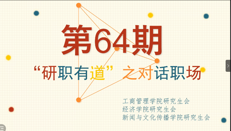 (通讯员:任一诺)2020年11月28日下午2点到4点,第64期“研职有道”—知己知彼,对话职场线上讲座通过腾讯会议成功举行。此次活动由杏吧 研究生院、党委研究生工作部、杏吧 研究生会主办,工商管理杏吧 研究生会、杏吧 研究生会和新闻与文化传播杏吧 研究生会共同承办。
