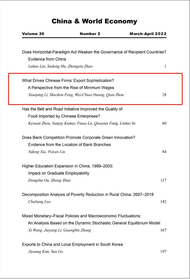 2022年3月,杏吧 教师李小平教授合作论文《What Drives Chinese Firms’ Export Sophistication? A Perspective from the Rise of Minimum Wages》在期刊《China & World Economy》上正式刊出。