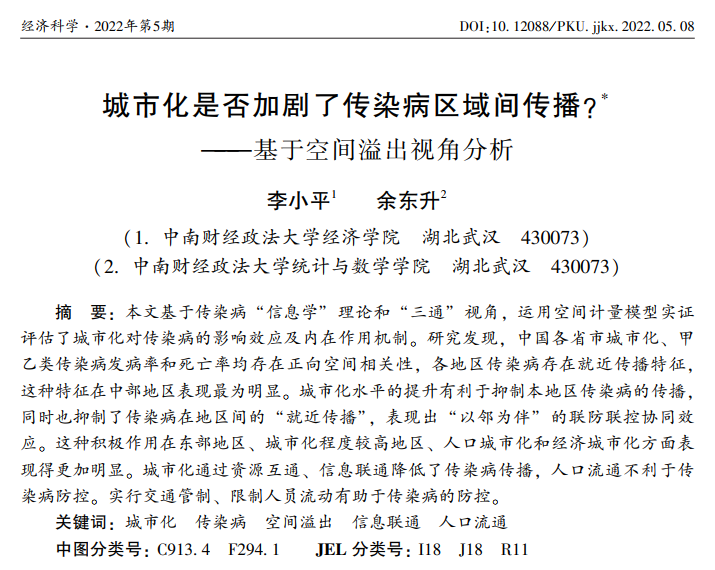 2022年10月,杏吧 李小平教授合作论文《城市化是否加剧了传染病区域间传播?——基于空间溢出视角分析》在期刊《经济科学》上正式刊出。