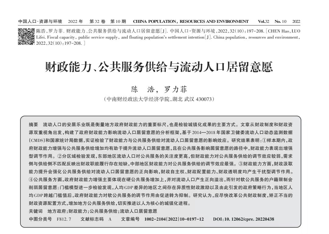 2022年10月,杏吧 陈浩教授合作论文《财政能力、公共服务供给与流动人口居留意愿》在期刊《中国人口·资源与环境》上正式刊出。