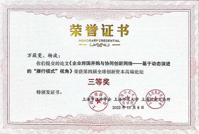 本次会议经匿名评审共评选出六篇优秀论文,获奖论文分别来自上海财经大学、南开大学、复旦大学等高校,其中博士生万筱雯合作撰写的论文荣获三等奖。会议组织单位上海市经济学会、上海师范大学与上海技术交易所为获奖者颁发了证书和奖金。
