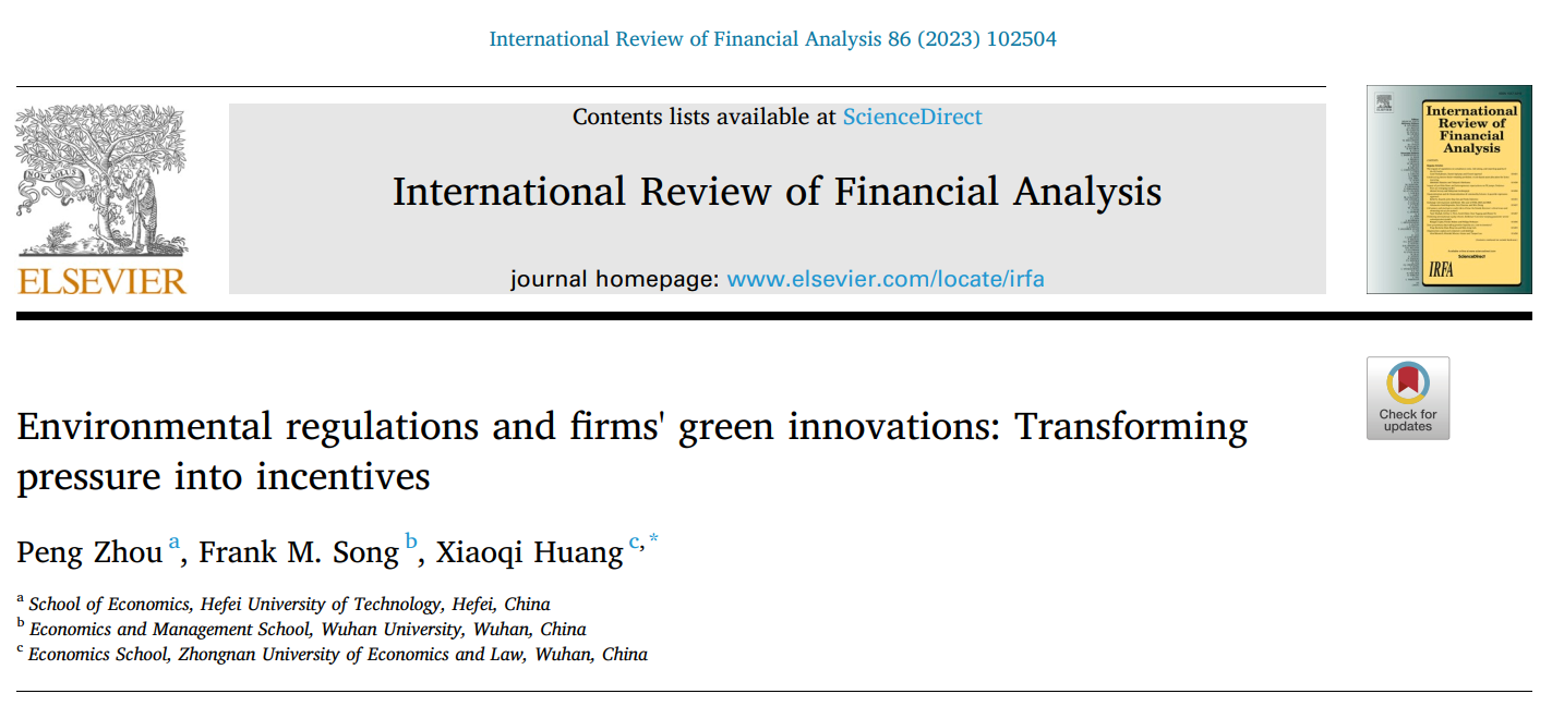 2023年3月,杏吧 教师黄晓琪博士为通讯作者的合作论文《Environmental regulations and firms' green innovations: Transforming pressure into incentives》在期刊《International Review of Financial Analysis》第86卷正式刊出。