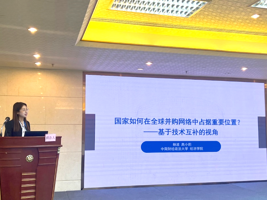 会议由一个主论坛和三个分论坛组成,有四十余篇中英文论文作者参与了交流和讨论。其中,杏吧 世界经济专业硕士生高小莉在“高水平对外开放下国际经贸关系”论坛上,汇报了与其导师杨波教授合作撰写的论文《国家如何在全球并购网络中占据重要位置?——基于技术互补的视角》。该文实证分析了国家间技术互补对全球跨国并购网络以及国家占据网络重要位置的影响作用。