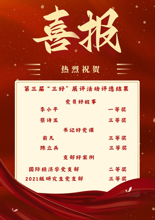 在本次展评活动中,经济杏吧 党委认真组织,积极推荐,凭借务实创新的内容和形式脱颖而出,最终荣获一等奖1项,二等奖1项,三等奖4项。其中,在“党员好故事”评选中,杏吧 院长李小平教授潜心科研、匠心育人,斩获一等奖的殊荣;2022级国际商务专业硕士研究生蔡诗玉通过自己参军入伍的切身感受,始终不忘党员初心,从军旅中来,到党员中去,获得三等奖。在“书记好党课”评比中,杏吧 党委副书记俞凡深入阐释新时代坚持和发展中国特色社会主义必须坚定“四个自信”,内容有思想有见地,获评三等奖;经济学党支部书记陈立兵认为教师党支部应该学习和掌握社会主义基本经济制度,在党的集中统一领导下不断进行改革,作品被评为三等奖。在“支部好案例”推选中,国际经济学党支部凭借不忘教育初心,助力“青椒”成长的案例课题荣获二等奖;2021级研究生党支部,以“青春心向党,喜迎二十大”为主题强化研究生党支部建设,作品最终获得三等奖。