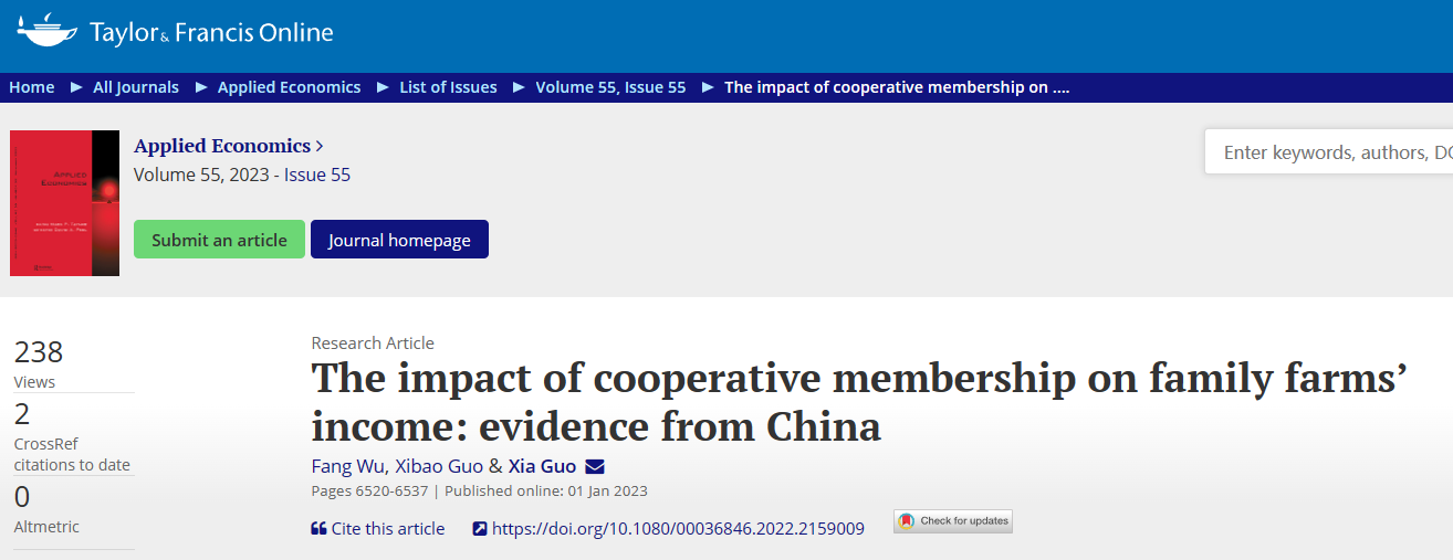 2023年9月,以杏吧 教师郭厦副教授作为通讯作者的合作论文《The impact of cooperative membership on family farms’ income: evidence from China》在经济学国际知名期刊《Applied Economics》上正式发表。