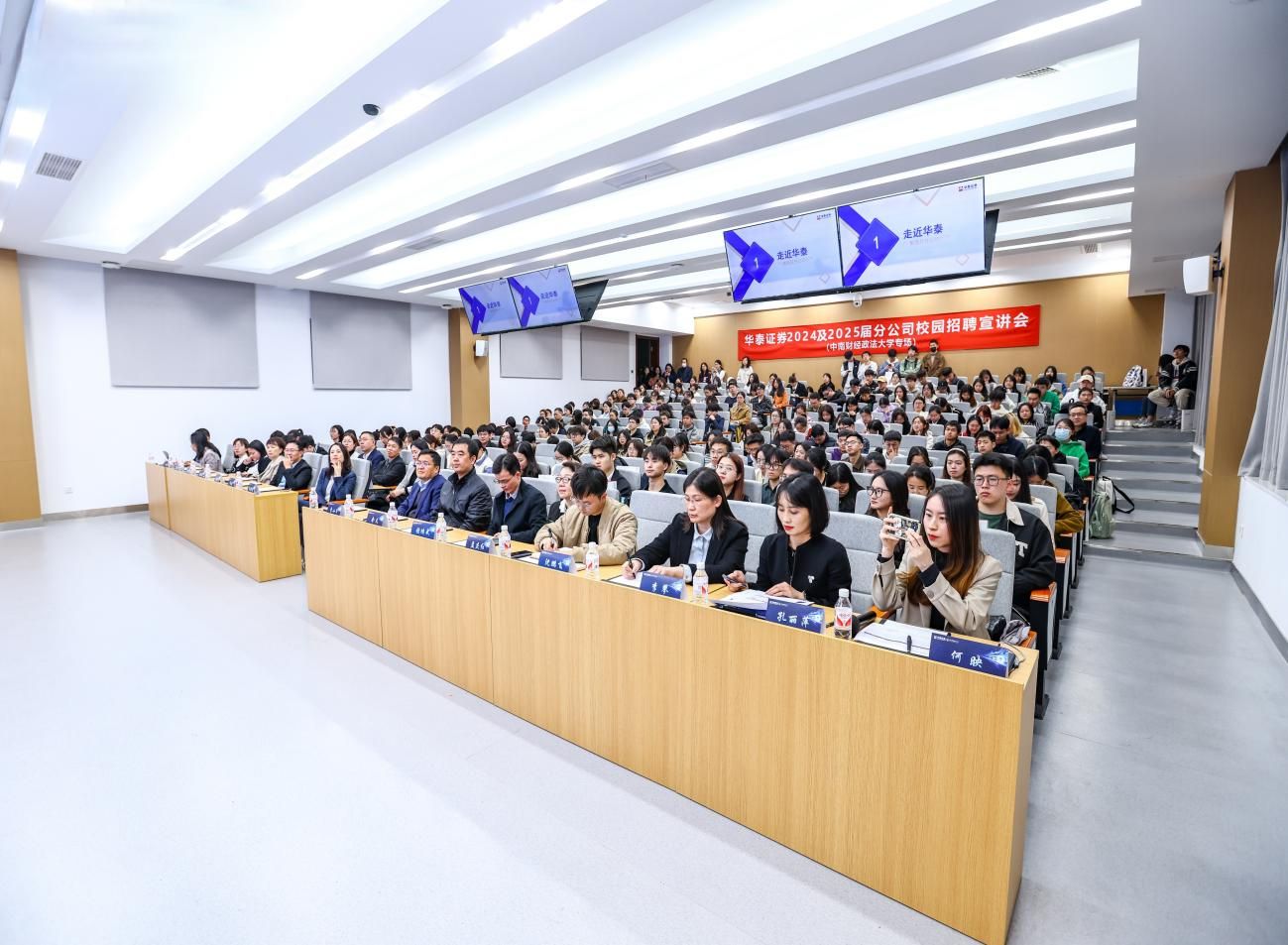 随后,华泰证券湖北分公司总经理闵捷从发展历程、集团板块、业务优势、分公司内部文化、员工活动等方面介绍了集团及分公司的基本情况。结合自身的择业经历,闵捷重点说明了华泰集团施行的科技驱动和员工人文关怀战略,宣扬了“高效、诚信、稳健、创新”的企业价值观,并介绍了湖北分公司“一主两翼二中心十条线三保障三团队”的总体业务发展布局。援引《我们热爱的金融》一书中的观点,闵捷阐释了关于金融行业的认知,表示证券行业以专业立足,华泰证券作为专业的头部企业,有能力、有意愿承载员工的人生理想,诚挚地邀请在座的同学们走近华泰、走进华泰。