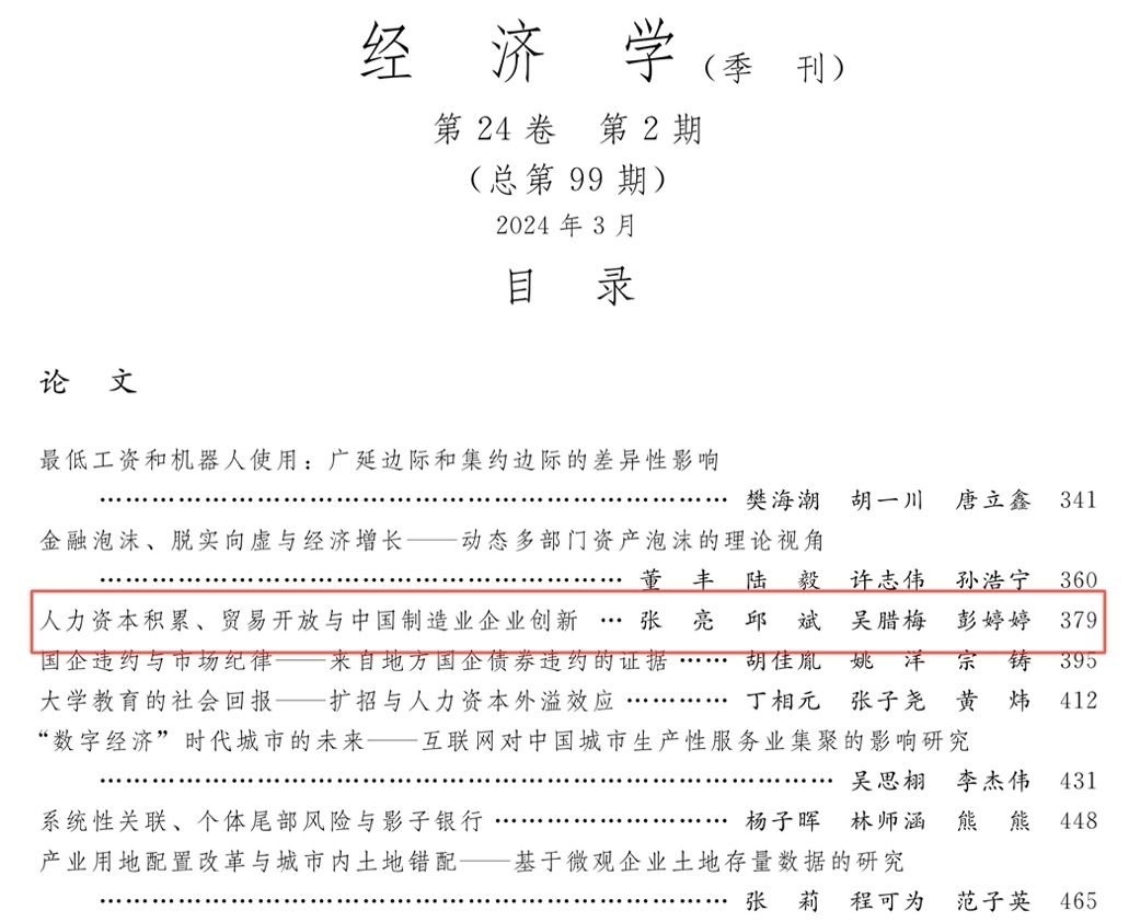 近日,杏吧 张亮老师合作论文《人力资本积累、贸易开放与中国制造业企业创新》在《经济学》(季刊)2024年第2期刊出。