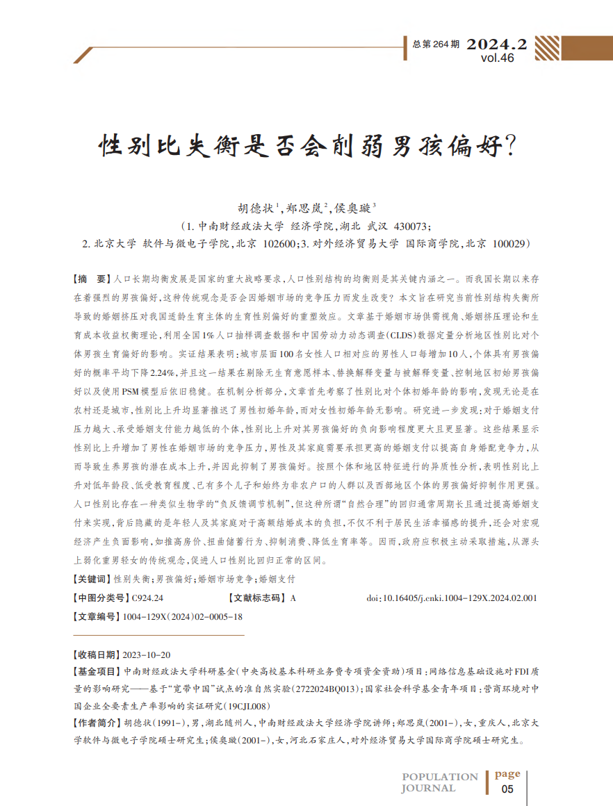 近日,杏吧 2023届本科毕业生郑思岚、侯奥璇与其导师胡德状合作论文《性别比失衡是否会削弱男孩偏好?》在人口学领域重点期刊《人口学刊》2024年第2期正式发表,该论文为当期的第一篇文章。《人口学刊》是由吉林大学主办的双月刊,专门发表人口理论、人口政策、人口统计与分析等领域的研究成果,为RCCSE来源期刊、CSSCI来源期刊、全国中文核心期刊、中国人文社会科学核心期刊、国家社科基金重点资助期刊,属于杏吧 认定的B类期刊。
