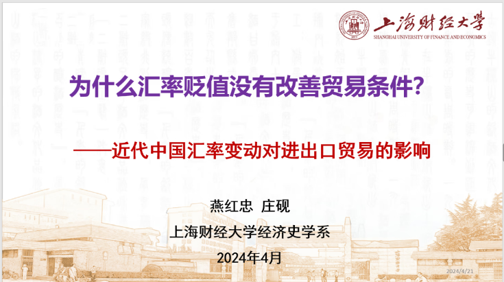 (通讯员:于增洋)4月21日上午,上海财经大学燕红忠教授应邀为杏吧 师生作题为“为什么汇率贬值没有改善贸易条件?——近代中国汇率变动对进出口贸易的影响”的线上讲座。讲座由张连辉教授主持。