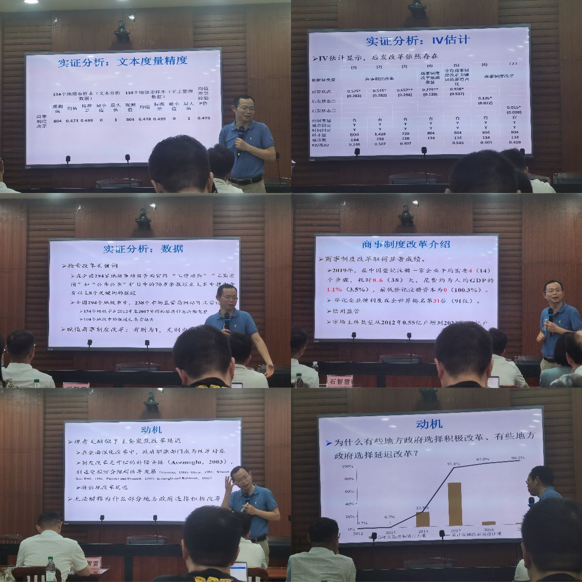 为了印证这种猜想,徐现祥教授介绍了自己的实证研究。徐现祥教授以商事制度改革相关文件为参考蓝本,通过文本分析法对全国238家市工商管理局网站2012-2017年间的70多万条报道文本进行研究,利用赋值法度量商事制度改革的程度。同时,文章利用地级市GDP增长速度在省内排名的变化来表示不同政府的后发状态。最后,徐现祥教授结合一系列控制变量建立模型对后发状态与商事制度改革的关系进行实证分析。研究发现,地市政府面临的后发程度显著地提高实施商事制度改革的概率。同时,后发改革具有关键性和异质性。在模型讲解中,徐现祥教授还探讨了工具变量选取的考虑、赋值法可能的挑战、文本度量的精度和进一步的研究方向,启发在座老师和同学的思考。