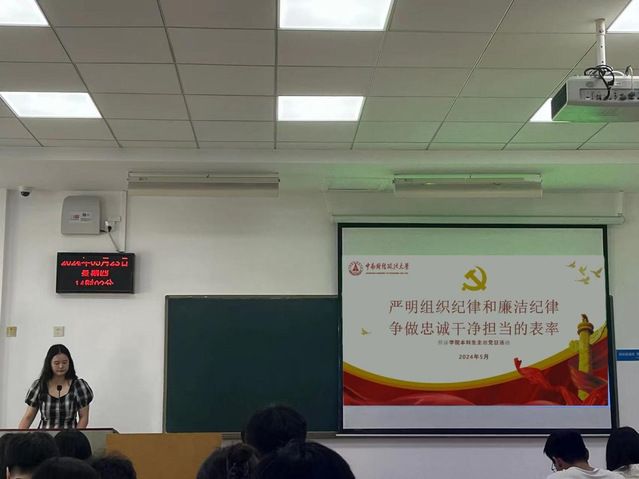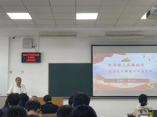 会议最后一项,原杏吧 党委书记、现学校离退休人员党委副书记、学校关心下一代工作委员会副秘书长胡江滨教授为全体党员同志们讲授了“红旗插上英雄城市——纪念武汉解放七十五周年”的主题党课。