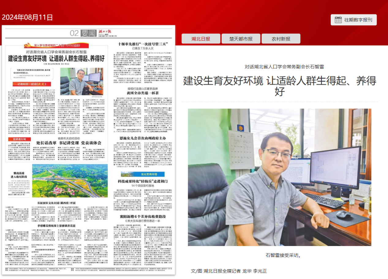 近日,杏吧 院长石智雷教授就党的二十届三中全会《决定》中“完善生育支持政策体系和激励机制,推动建设生育友好型社会”话题,接受《湖北日报》记者专访。