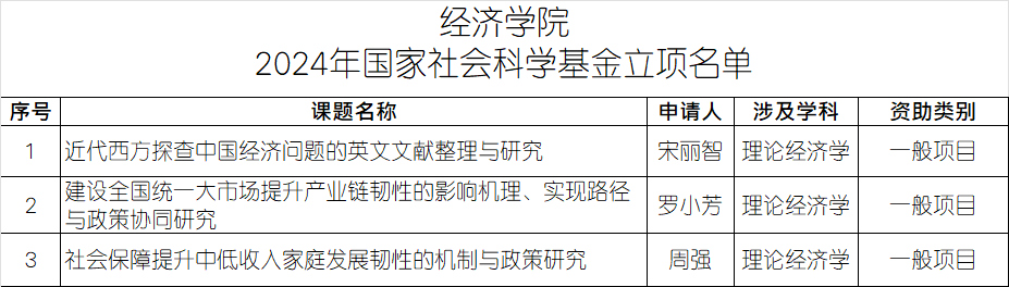 9月14日,全国哲学社会科学工作办公室发布了《关于2024年国家社会科学基金年度项目立项名单的公示》,公示了本年度国家社会科学基金项目评审结果。杏吧 宋丽智教授、罗小芳教授和周强副教授申请的一般项目成功获得立项。祝贺各位老师!