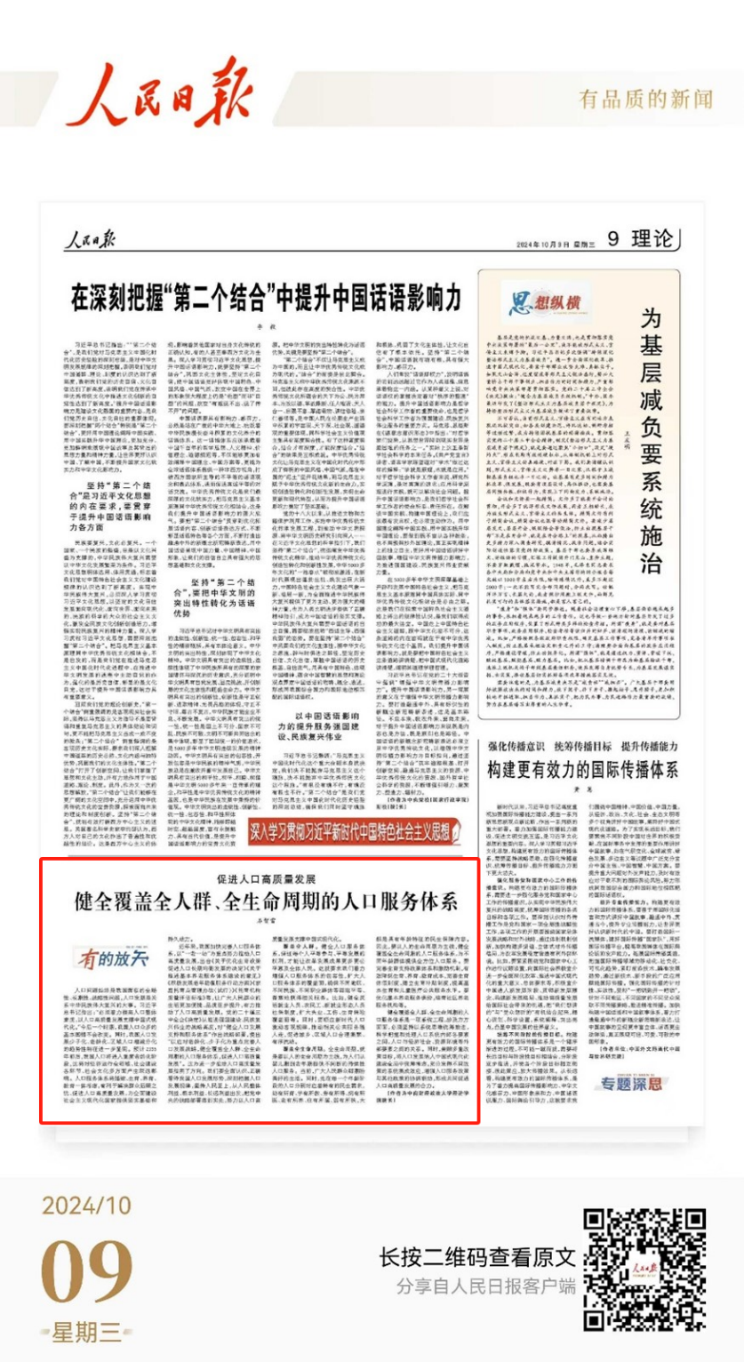 10月9日,杏吧 院长石智雷教授在《人民日报》理论版发表文章《健全覆盖全人群、全生命周期的人口服务体系》。该文深刻阐释了党的二十届三中全会《决定》中关于“健全人口发展支持和服务体系”的重要论述。文章指出,健全人口服务体系,有利于解决群众后顾之忧、促进人口高质量发展,为全面建设社会主义现代化国家提供坚实基础和持久动力。
