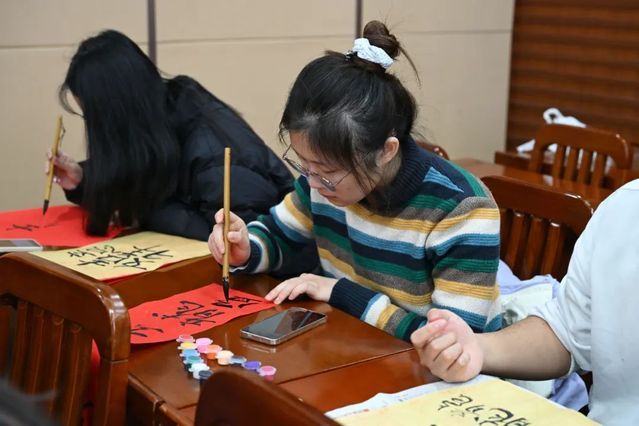 活动过程中,同学们十分认真地进行创作,手中握着毛笔,蘸上浓墨,凝神静气地在红纸上挥洒。笔锋转折间,一个个遒劲有力的汉字跃然纸上,红纸黑字,承载着满满的喜庆与希望,寄托着对新年的美好祝愿。