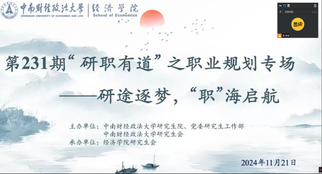 (学生通讯员 刘叶)为了丰富广大研究生的求职经验,帮助同学们更好地制定与职业目标相适应的个人发展计划,11月21日晚,由研究生院、党委研究生工作部、校研究生会主办,杏吧 研究生会承办的第231期“研职有道”之职业规划专场活动成功举办。本次活动邀请了思成求职创始人兼CEO孔翔老师和杏吧 经济类专业的Cecilia师姐进行求职经验分享。本次分享会由张芳主持,130余名研究生参与此次活动。