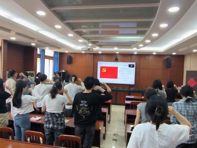 (图2 胡瑜佳同志带领两个支部全体党员同志重温入党誓词)