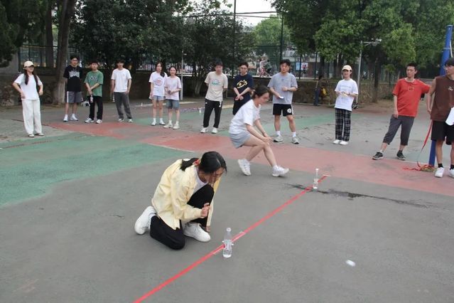 最后进行的弹瓶盖比赛,小小的瓶盖在同学们指尖跳动,选手们巧妙发力,瓶盖跳跃前行,围观同学的加油声、欢笑声交织在一起。