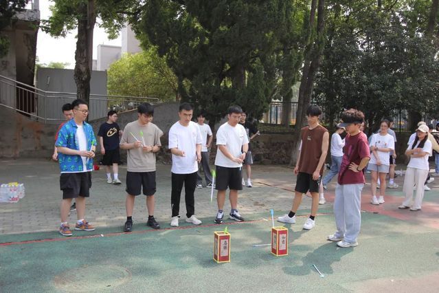 在投中经彩中,同学们手持壶矢,瞄准靶心,或屏息凝神,或潇洒一抛,壶矢入壶,赢得喝彩。