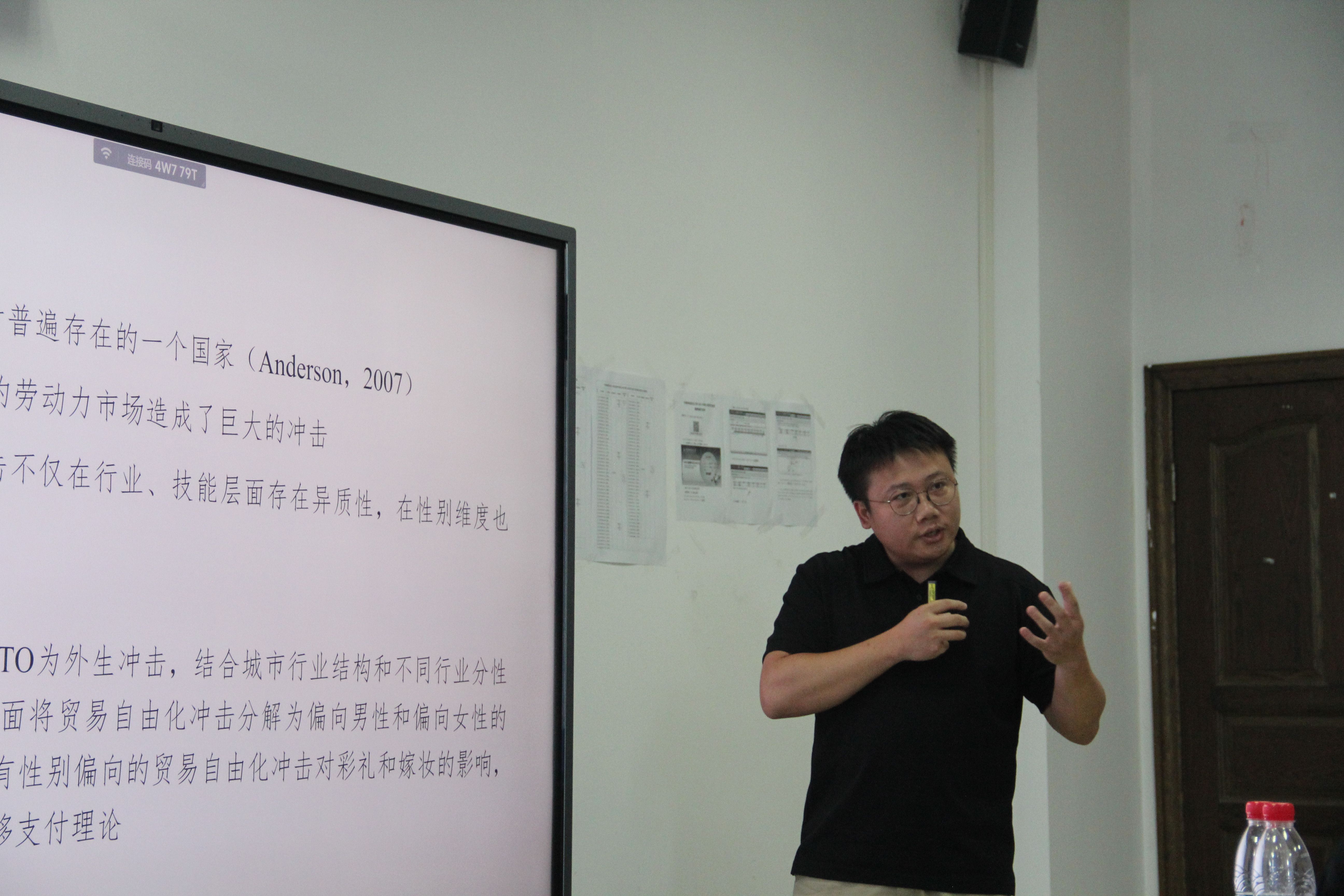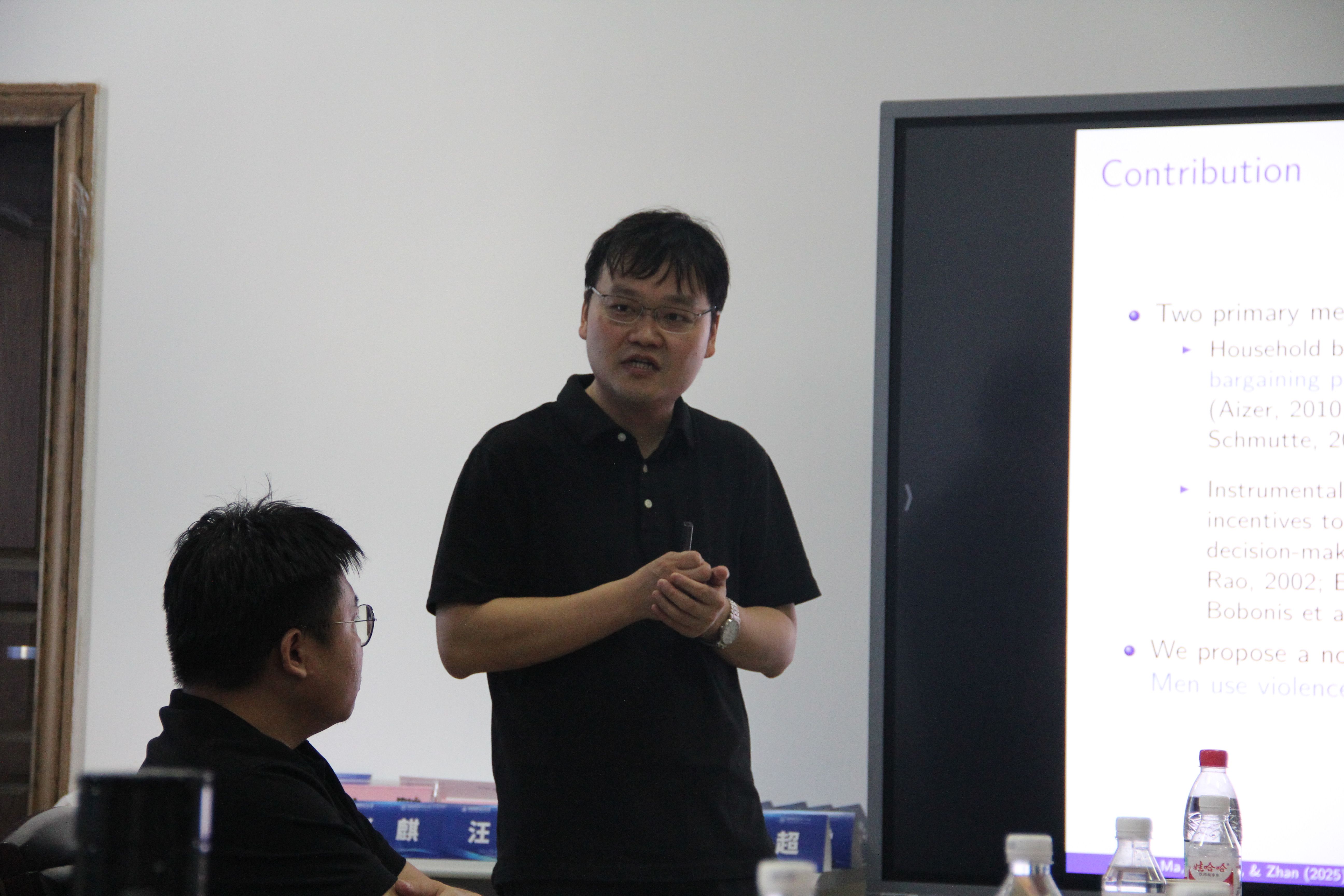 论坛首先由武汉大学郭汝飞副教授带来题为《Export Slowdown and Intimate Partner Violence》的精彩报告。郭汝飞副教授基于中国裁判文书网10万余起亲密伴侣暴力(IPV)案件数据,结合海关出口数据构建经济冲击工具变量,深入研究并探讨了出口放缓与亲密伴侣暴力关系的关系及其作用机理,并结合中国社会发展的现实讲述了家庭关系与贸易出口的有趣关系,该研究为理解全球化进程中的社会问题提供了新的视角。在随后的交流环节,与会师生围绕家暴行为的判定标准、家暴根源、家暴对生产效率的负面影响、生育率变化以及育儿时间分配等问题展开了深入探讨。