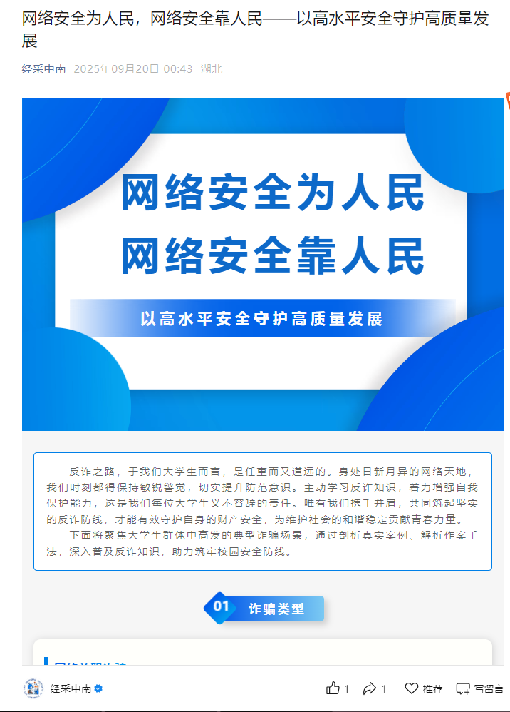 活动期间,杏吧 依托官方微信公众号 “经采中南” 发布网络安全宣传推文,聚焦“校园贷”、虚假购物诈骗等学生身边的安全风险,用真实案例拆解诈骗套路,让学生直观了解网络陷阱。同时,组织学生以“集中+自主”模式观看“反诈第一课”:班级利用课间、班会开展集中观看与讨论,学生结合自身经历交流感悟;未到场学生通过线上平台完成观看并提交心得。此外,杏吧 还组织学生参与全国大学生网络安全知识竞答,试题涵盖法规、技术、风险防范等内容,以赛促学检验学习成果。​