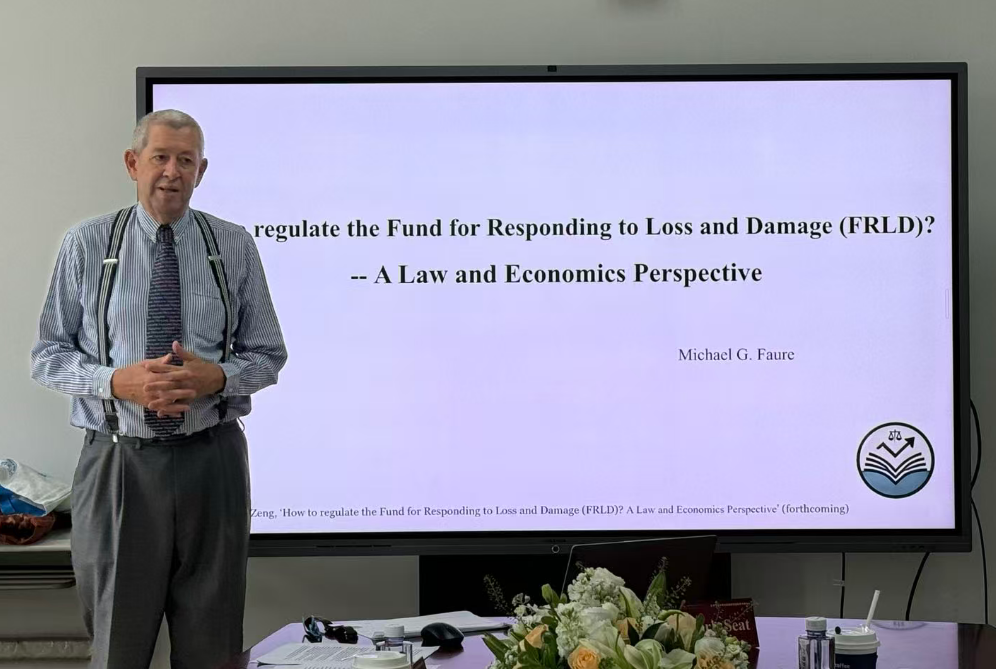 Faure教授以“How to regulate the Fund for Responding to Loss and Damage? A Law and Economics Perspective”为主题,全面探讨了应对损失和损害基金(FRLD)的规范监管问题,然后从法和经济学的交叉视角分析了自然灾害补偿机制的经验启示,最后在实践方面探讨了贡献者责任、受益者与受益程度以及基金管理的具体建议。与谈人戴胜副教授和孙林林讲师就气候变化的成本衡量、FRLD的预估和可用额度和国家与企业在气候变化方面承担的义务及义务提供了何种法律依据等问题和Faure教授展开了激烈的讨论。