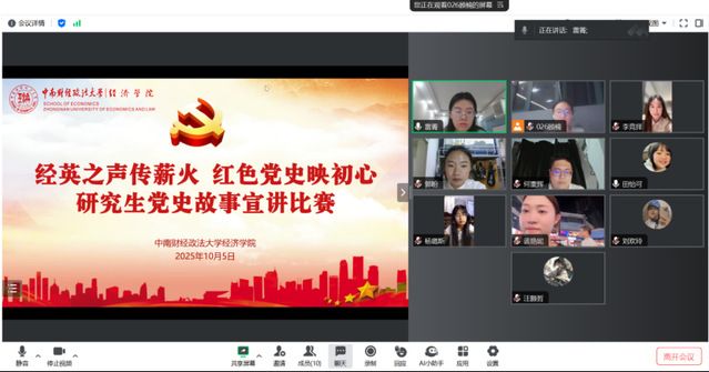 2025级政治经济学专业的郭盼同学以“甘将热血沃中华”为题,带我们走进了抗日女英雄赵一曼用生命践行对祖国的誓言、独留一封红色家书的故事,让我们深刻领悟到新时代青年守护这片土地的责任与使命担当;2025级西方经济学专业的何重辉同学以“新中国航空工业的发展”为题,分享了新中国航空工业发展的党史故事,激励我们普通人用坚守铸就辉煌,书写更多中国篇章;2025级国际商务专业的蓝艳妮同学以“赣土烽火,抗战荣光”为题,讲述了她的家乡江西这片土地的烽火与荣光,鼓舞着我们把家国情怀写进青春,把英雄气概融入血脉。