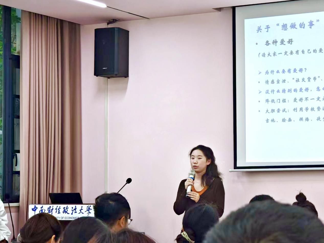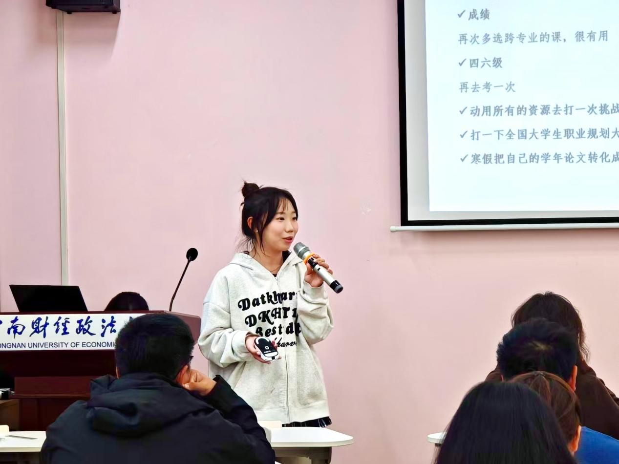 数字经济2201班的许怡馨则向新生分享她的故事与学习心得,着力于竞赛与科研能力培养,打破新生对专业实践的“门槛恐惧”。她系统介绍了竞赛选题、团队组建及科研入门的基础路径,分享相关信息获取渠道,为新生搭建起从理论到实践的衔接桥梁。