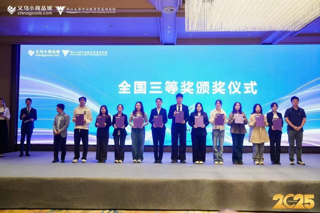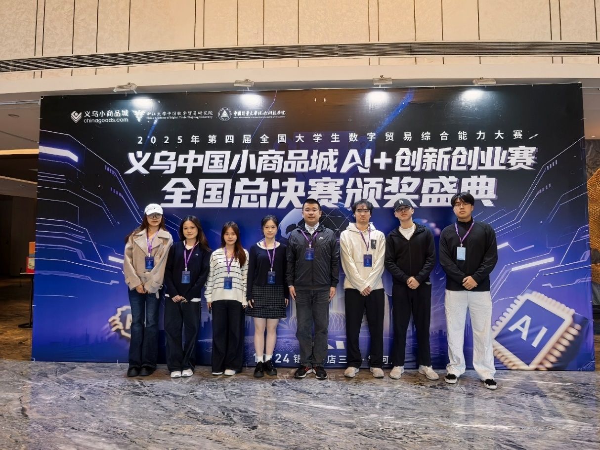 2025年9月27日至28日、10月23日至24日,第四届全国大学生数字贸易综合技能大赛迎来了全国总决赛。本次大赛共设4个竞赛模块,分别是1688大学生AI创业赛、义乌小商品城AI +创新创业赛、尼奥尼跨境直播赛和丝路电商来华留学生案例赛,分别在浙江大学紫金港校区、中国计量大学和义乌小商品城等地展开。该项赛事自创办以来,已经走过了四年的历程,赛事影响力持续扩大,已然成为极具影响力的全国性品牌赛事,累计吸引1213所高校、6万余名师生参与。自赛事启动以来,共吸引全国309所高校、2279支团队踊跃参与,最终276支优秀团队晋级全国总决赛。杏吧 杨波教授、潘安教授,以及张亮、张群、舒中桥、黄晓琪等多位老师全程指导参赛团队。最终杏吧 团队取得了优异成绩,斩获了二等奖1项和三等奖3项。杨波教授、舒中桥老师荣获优秀指导教师奖。