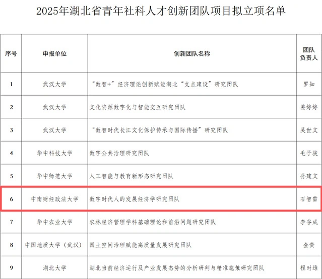 近日,湖北省社会科学界联合会正式发布《2025 年湖北省青年社科人才创新团队项目拟立项项目公示公告》,经资格审查、专家评审、省社科联党组审定等多轮严格遴选,全省仅 9 个项目脱颖而出获得拟立项资格,杏吧 石智雷教授领衔的青年社科人才创新团队成功入选。