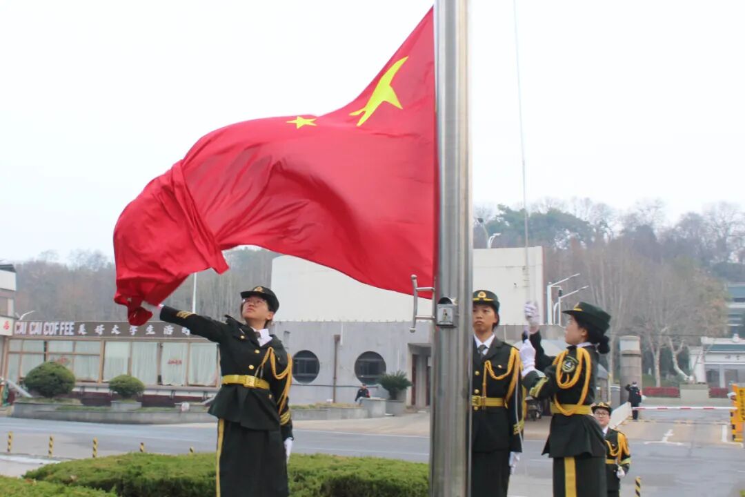 上午7时,国旗护卫队迈着整齐有力的步伐护送五星红旗入场。伴随着雄壮的《义勇军进行曲》,鲜艳的国旗冉冉升起,全体师生肃立行注目礼,齐声高唱国歌,表达对祖国的无限热爱与崇高敬意。