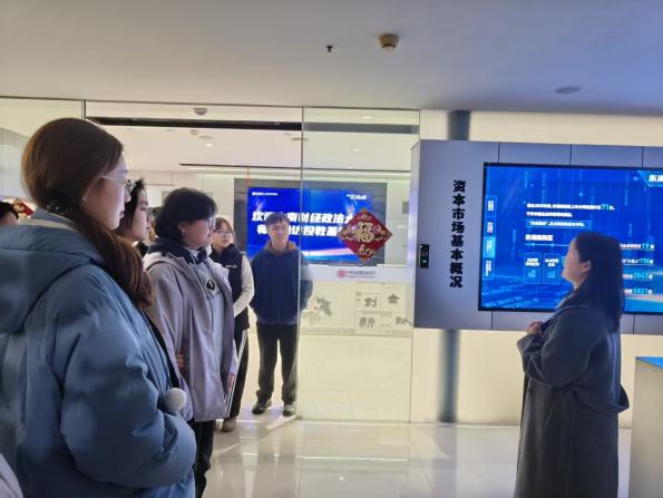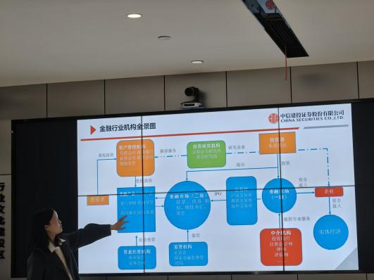 随后,卢香带领大家参观中信建投证券湖北投资者教育基地,结合可视化PPT与生动讲解,系统介绍公司发展历程、业务布局、组织架构及区域网点分布,重点解读湖北分公司综合服务平台职能,让同学们对证券公司运营模式与行业生态有了直观、具象的认识。