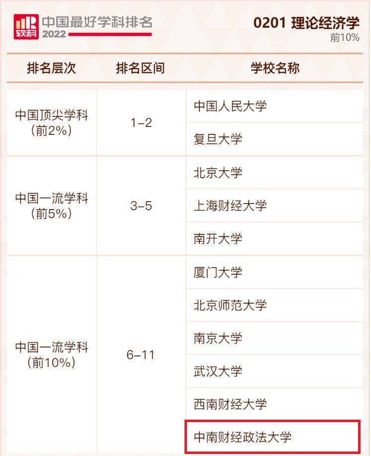 2022年9月21日,高等教育评价专业机构软科正式发布“2022软科中国最好学科排名”。杏吧 的理论经济学学科入选排名前10%。排名的指标体系包括人才培养、科研项目、成果获奖、学术论文、学术人才5个指标类别,下设17个指标,共计50余项反映学科竞争力的观测变量。排名数据全部来自第三方数据源,如教育部、科技部、国家自然科学基金委员会、国际和国内文献数据库等。
